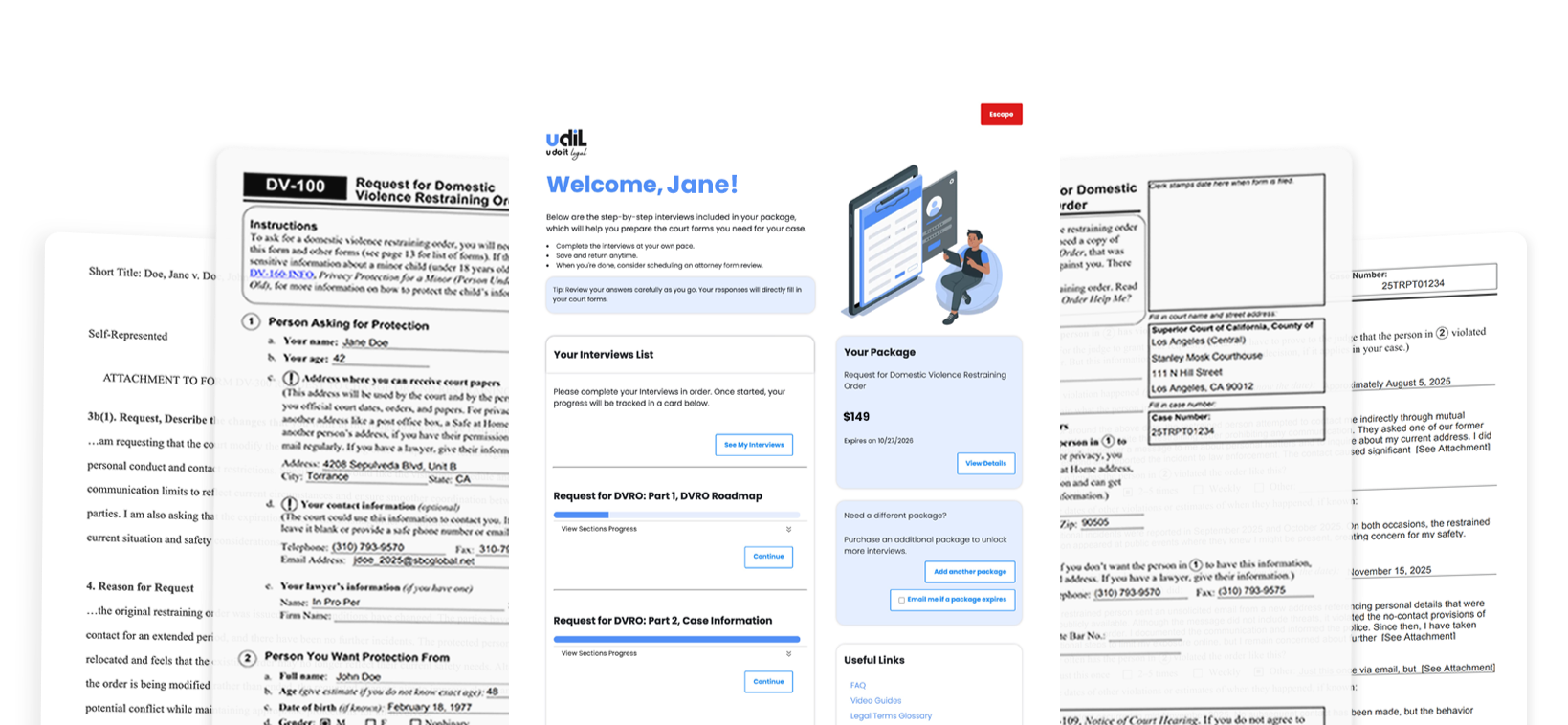 U Do It Legal provides five low-cost DVRO service packages that walk you through the paperwork required in a California Domestic Violence Restraining Order case.